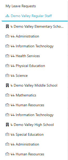 . These tabs correspond to departments within the location directly above them. Clicking a department tab shows all leave requests for that specific department at that location.