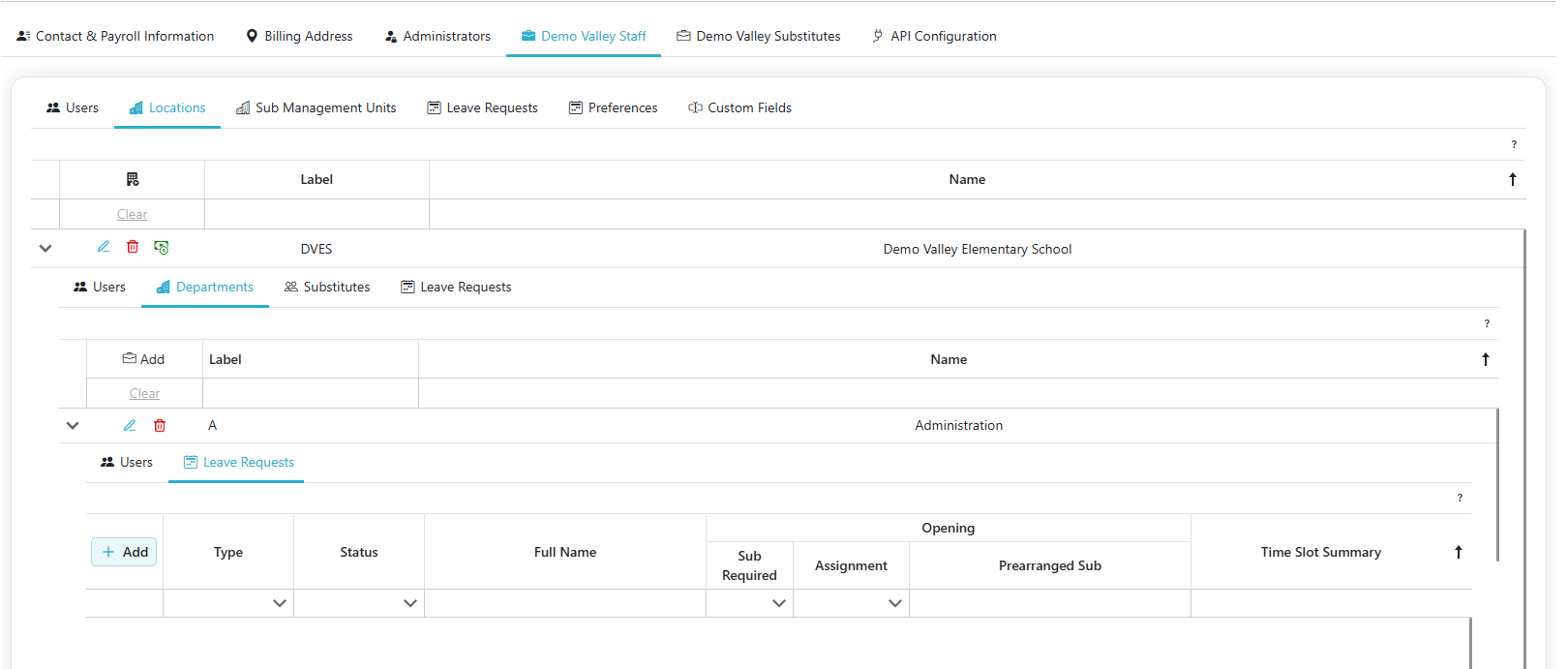- The Leave Requests section allows users to manage leave requests for a department at a specific location. Users can add, edit, and approve or deny leave requests as needed.