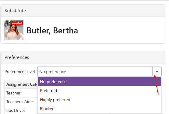 - The Location's Preference Level for the substitute can be set using the dropdown. The Preference Levels are: 'No Preference' which does not effect the substitute's ranking; 'Preferred' which adds 1 to the substitute's ranking; 'Highly Preferred' which adds 2 to the substitute's ranking; 'Blocked' which make it so the substitute is not eligible to work at that location.