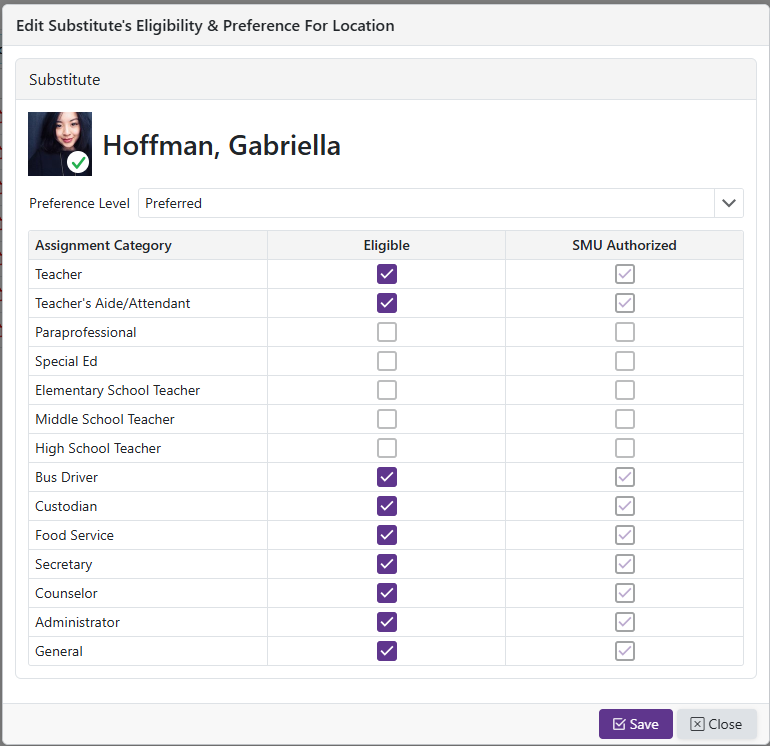 - If a substitute is authorized to be a 'Teacher', they are also eligible for all teacher types: 'High School Teacher', 'Middle School Teacher', 'Elementary School Teacher'.