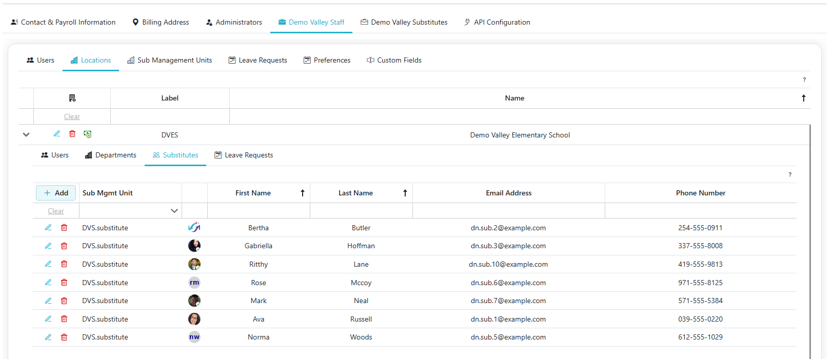 - The Substitutes section allows users to manage the substitute staff list for a specific location. Users can add or remove substitutes as needed.