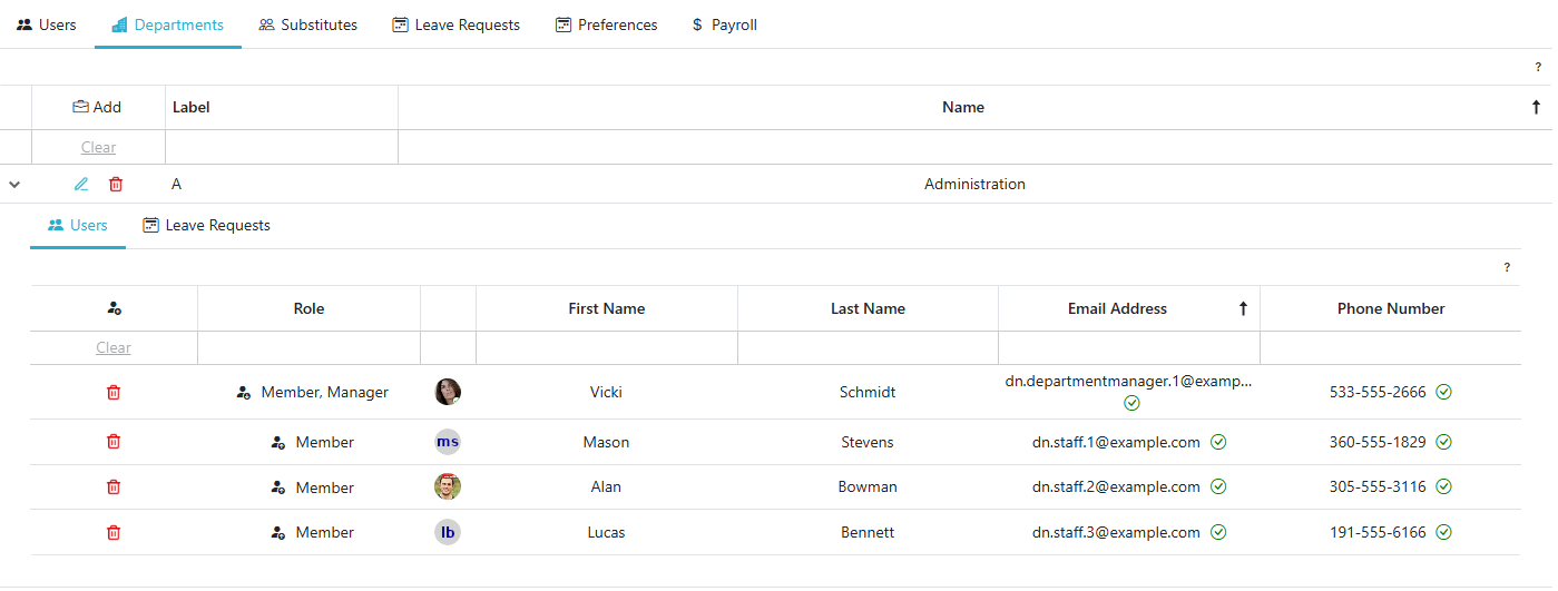 - The Users section allows administrators to manage users within a department at a specific location. Administrators can add, remove, or promote users as needed.