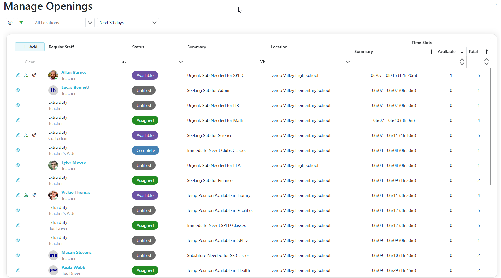 | Unfilled | Opening where no time slots were filled by substitutes (final state) |