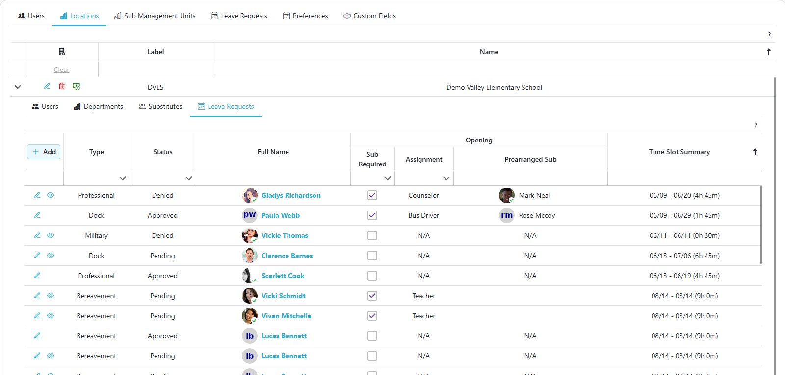 - The Leave Requests section allows users to manage leave requests for a specific location, including adding, editing, and approving/denying requests.