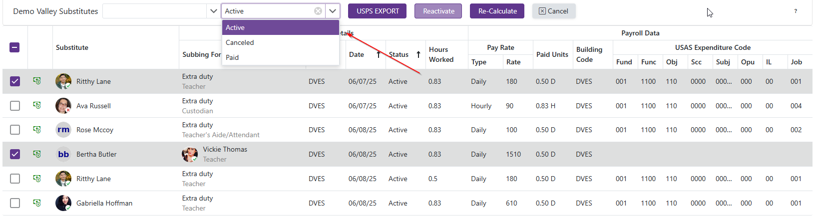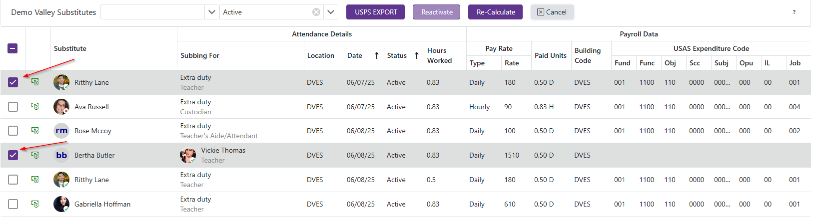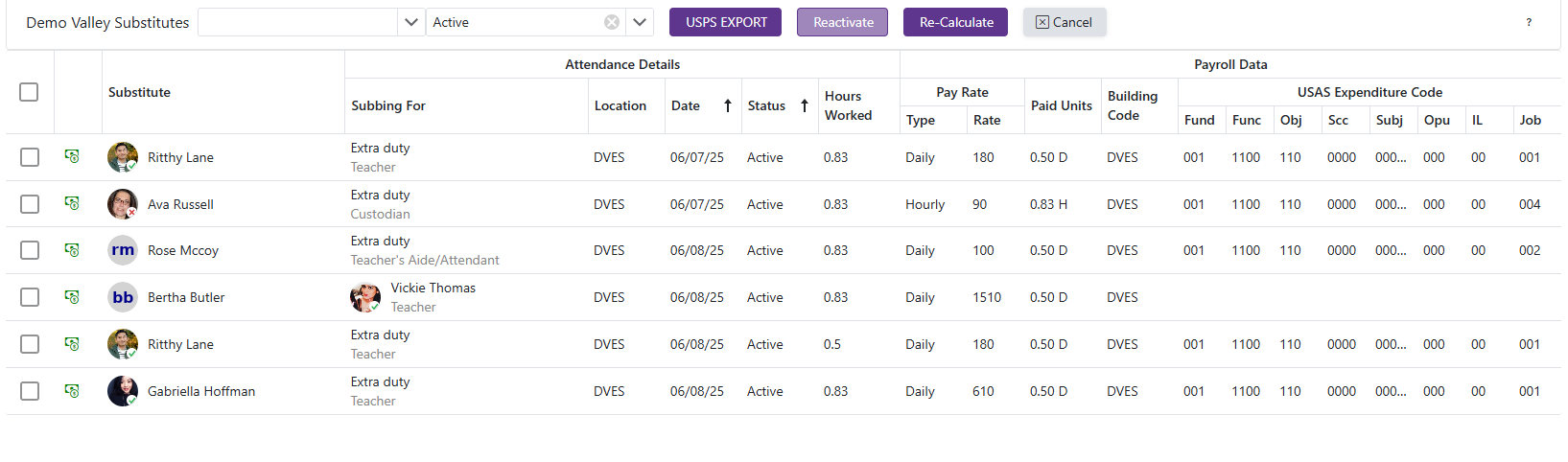 to edit any payroll information for that row. Most of the payroll information should auto-populate using the Mapping Rules set on the 'Timesheet Configuration' tab under Client Admin and also the payroll information for each substitute's, regular staff member's, and location's payroll information. This grid is populated when a substitute's attendance have been verified.