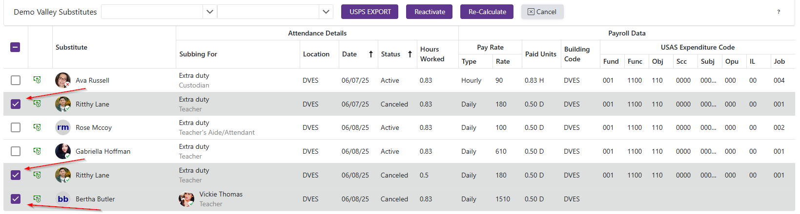 button to Re-Calculate the payroll info for those entries. Recalculating will update the selected rows to apply any changes made to the sub's payroll data, location's payroll data, and mapping rules that were updated after the entry has already been added to the manage timesheets page. It uses the payroll data at the time the attendance was verified when being added to the manage timesheets page, any changes made after that will want to Re-Calculate so they are applied.