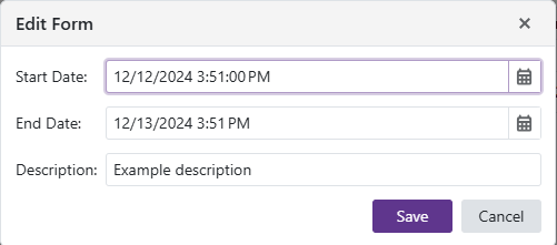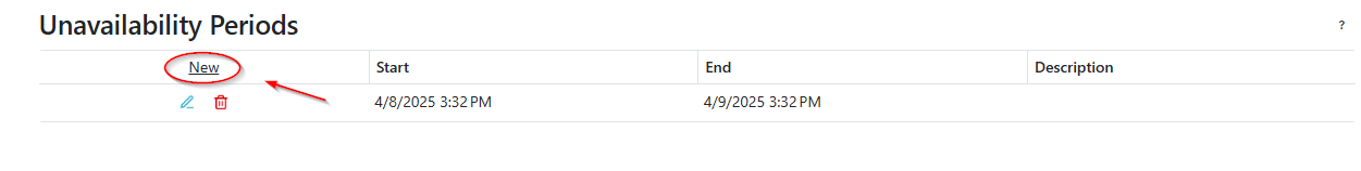 - Click ‘New’ in the Unavailability Periods section to add a date range during which you will not be available.