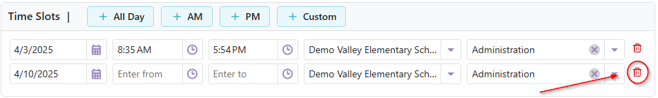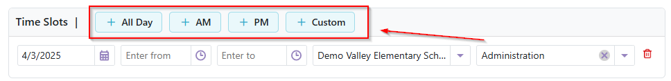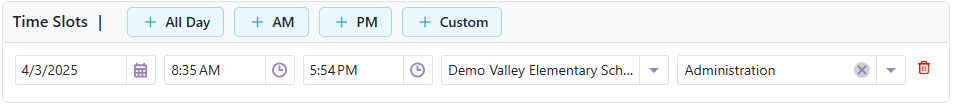 - 'AM': adds a time slot with the From Time set to the Start Time set in the location's preference and the To Time set to noon