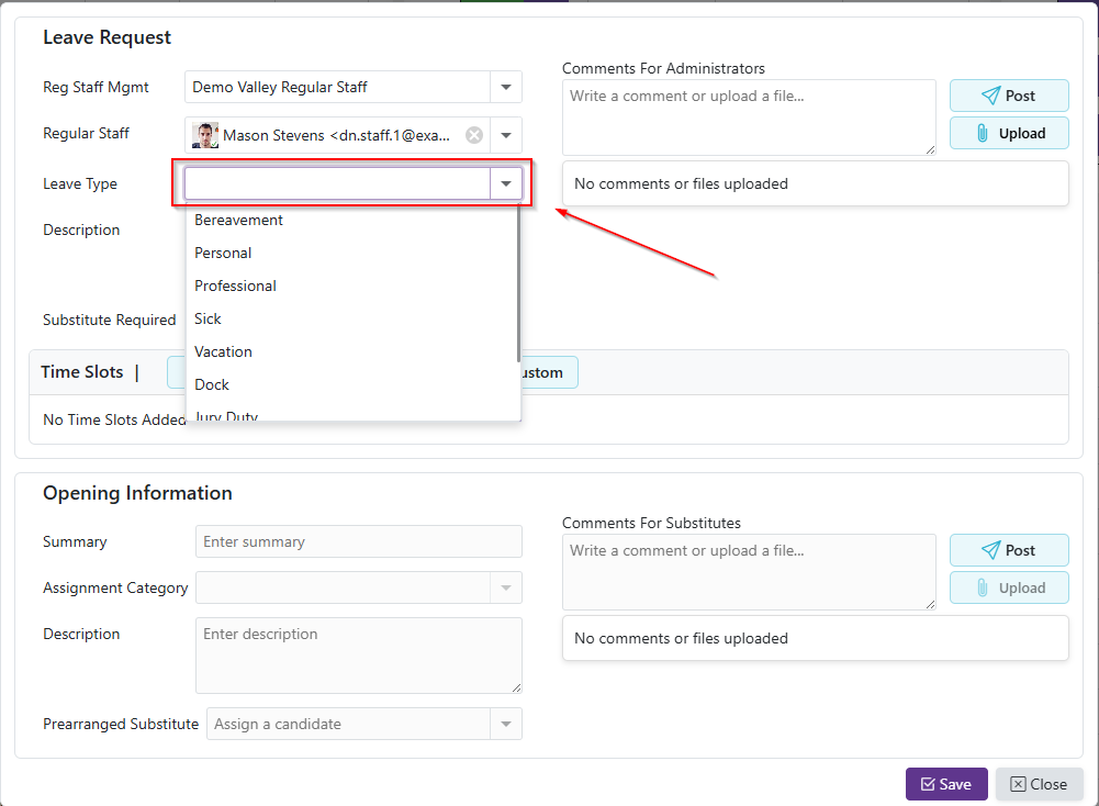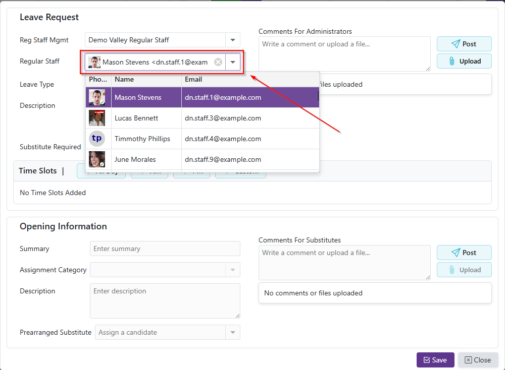 Click the Regular Staff dropdown and select the staff member requesting leave.