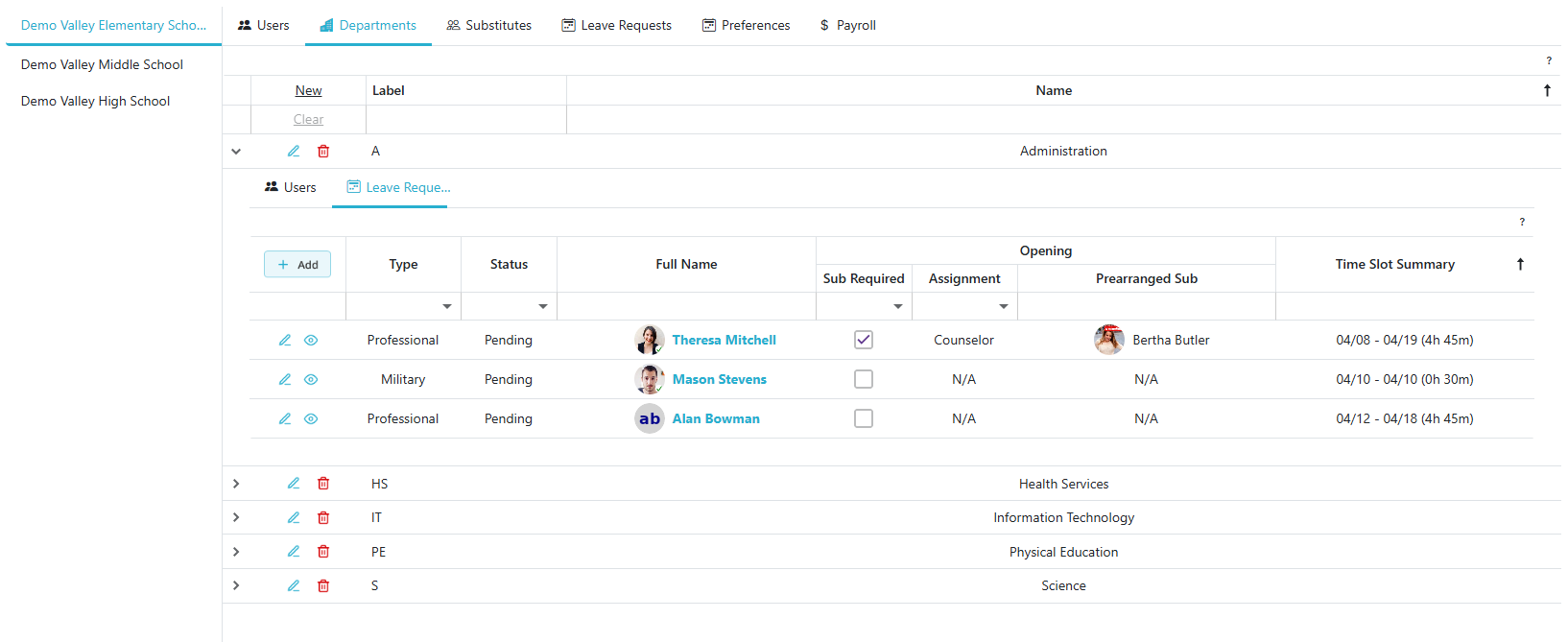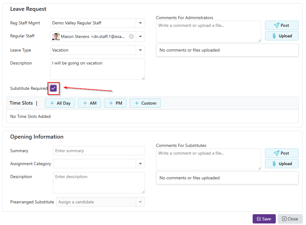 If a substitute is needed, check the ‘Substitute Required’ box.