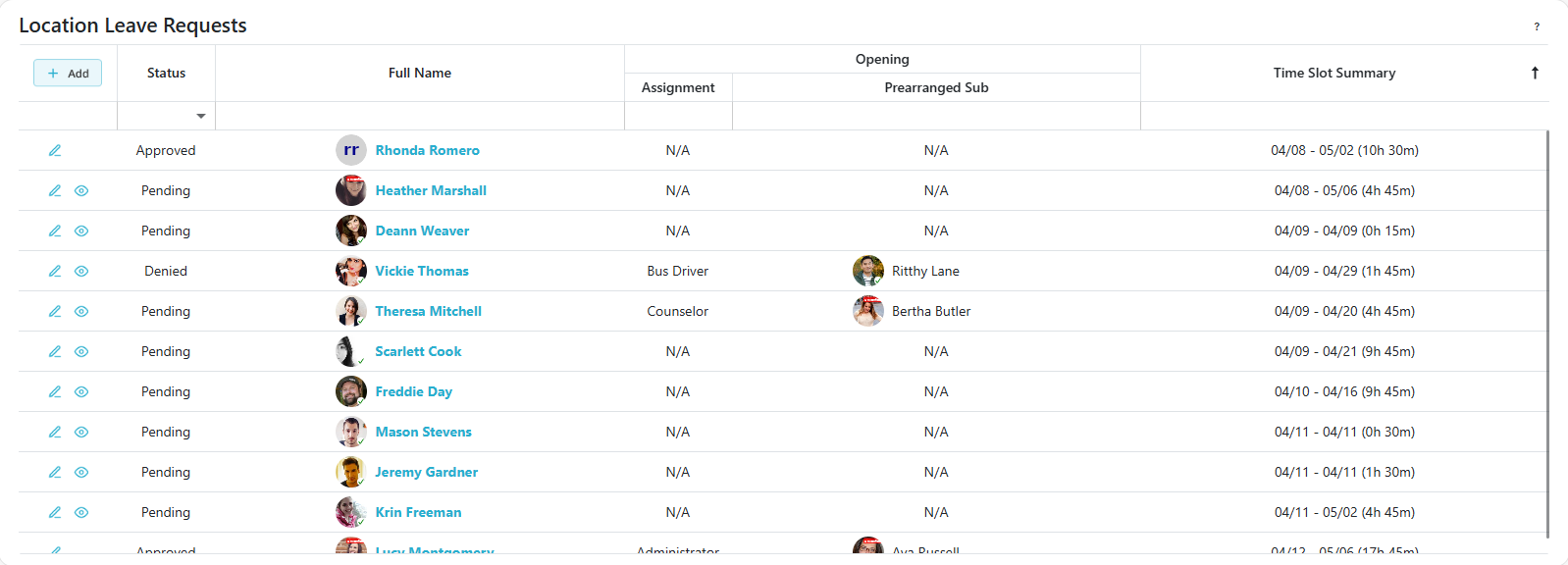 | Active | Substitute is assigned and has upcoming time slots |