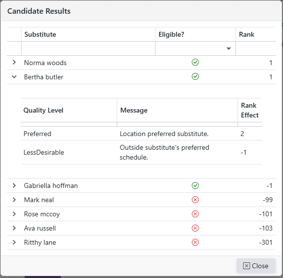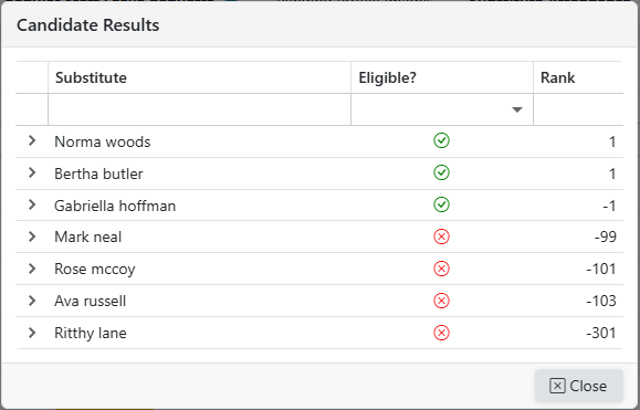 to show the Qualified/Eligible Substitutes, their ranking, and details for the ranking.