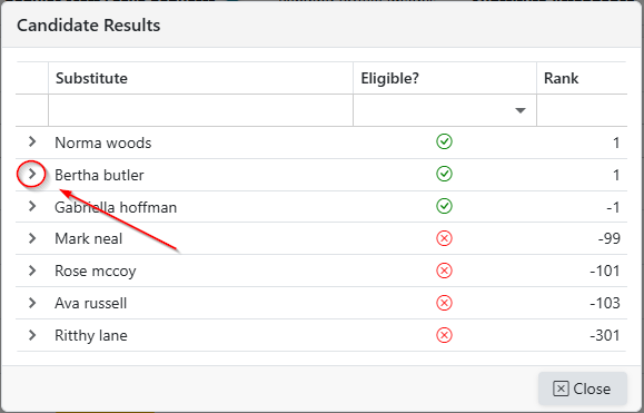 - Clicking the '>' opens the details for the ranking of that substitute