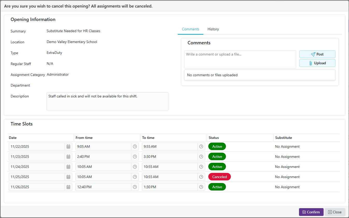 | Complete | Opening where substitutes attended all time slots and attendance was verified (final state) |