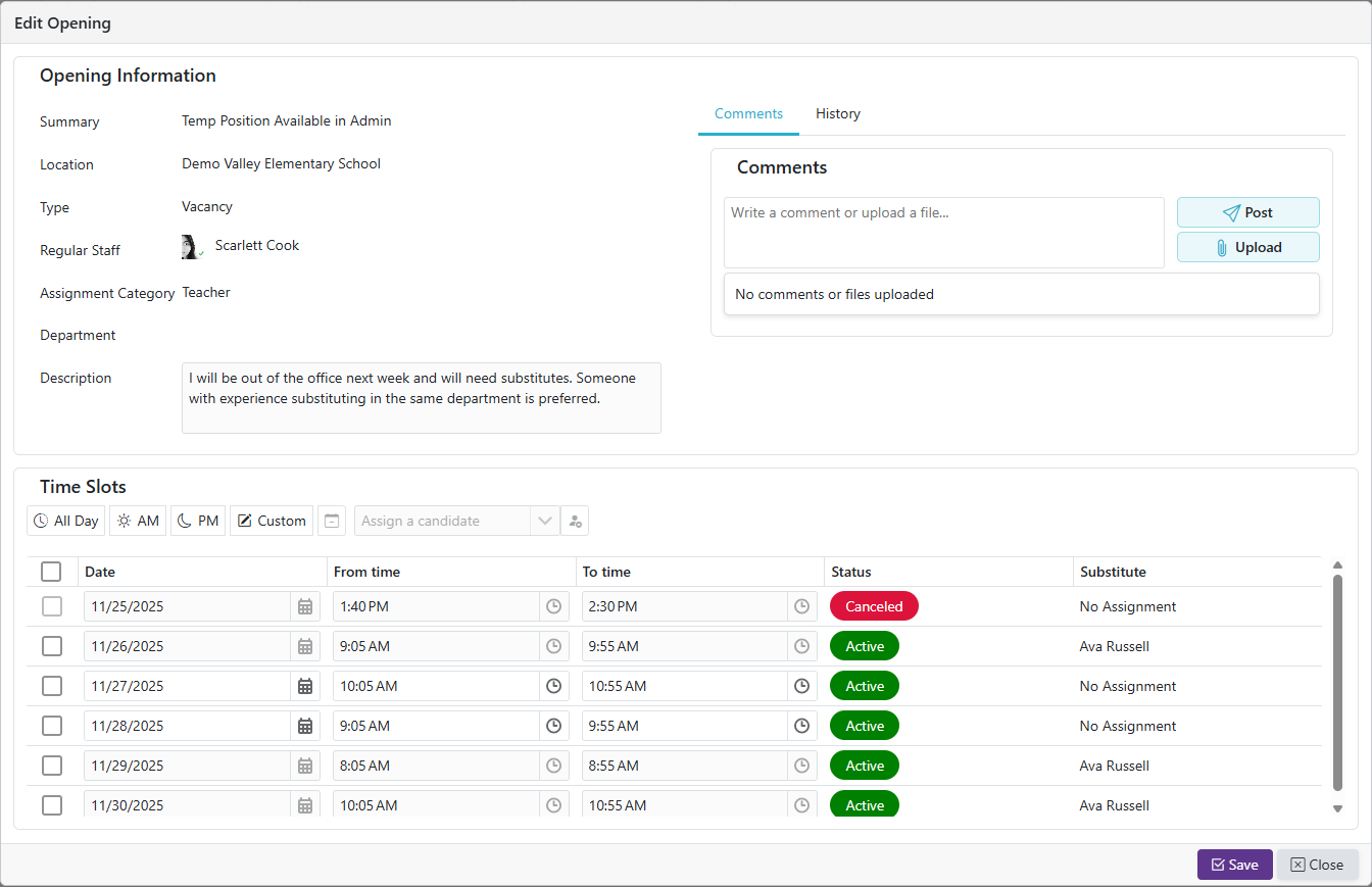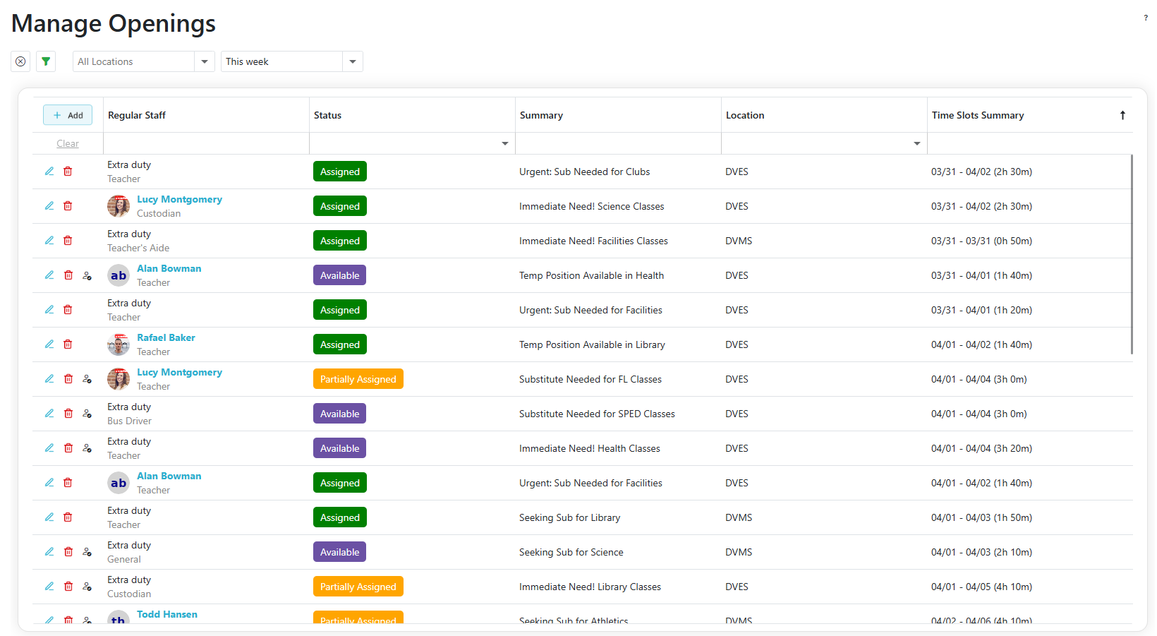 | Available | Opening with at least one time slot that still needs filled |
