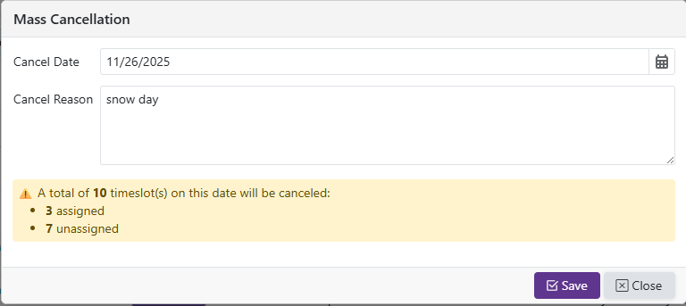 to begin mass canceling all time slots on a specific date. Select a Date and enter a Reason then hit save.