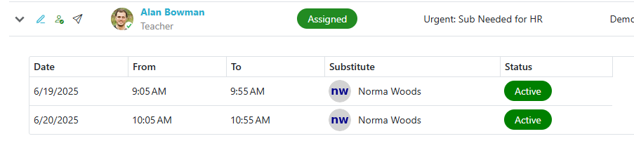 | Assigned | Opening with all time slots assigned to substitutes |