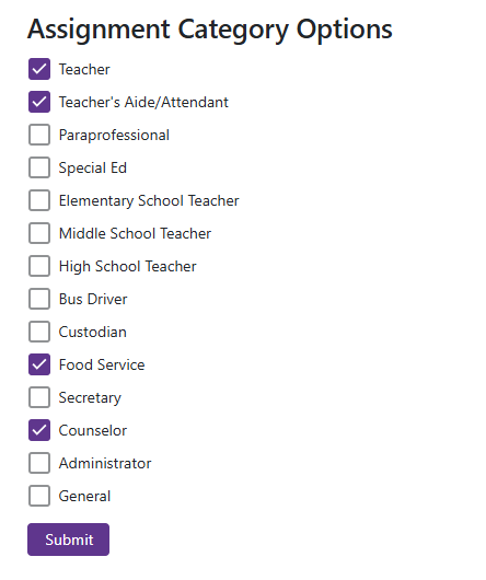 Assignment Categories The Assignment Categories section allows users to select the assignment categories that they work. -After selecting the desired assignment categories, users must click ‘Submit’ to save their changes.