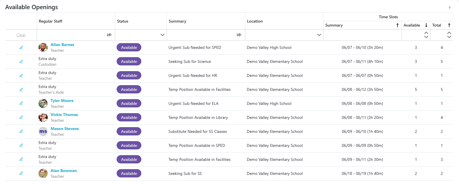 -If 'Substitutes Must Verify Their Own Attendance' is enabled in the location's preferences, the 'Substitute Verification' column becomes available: