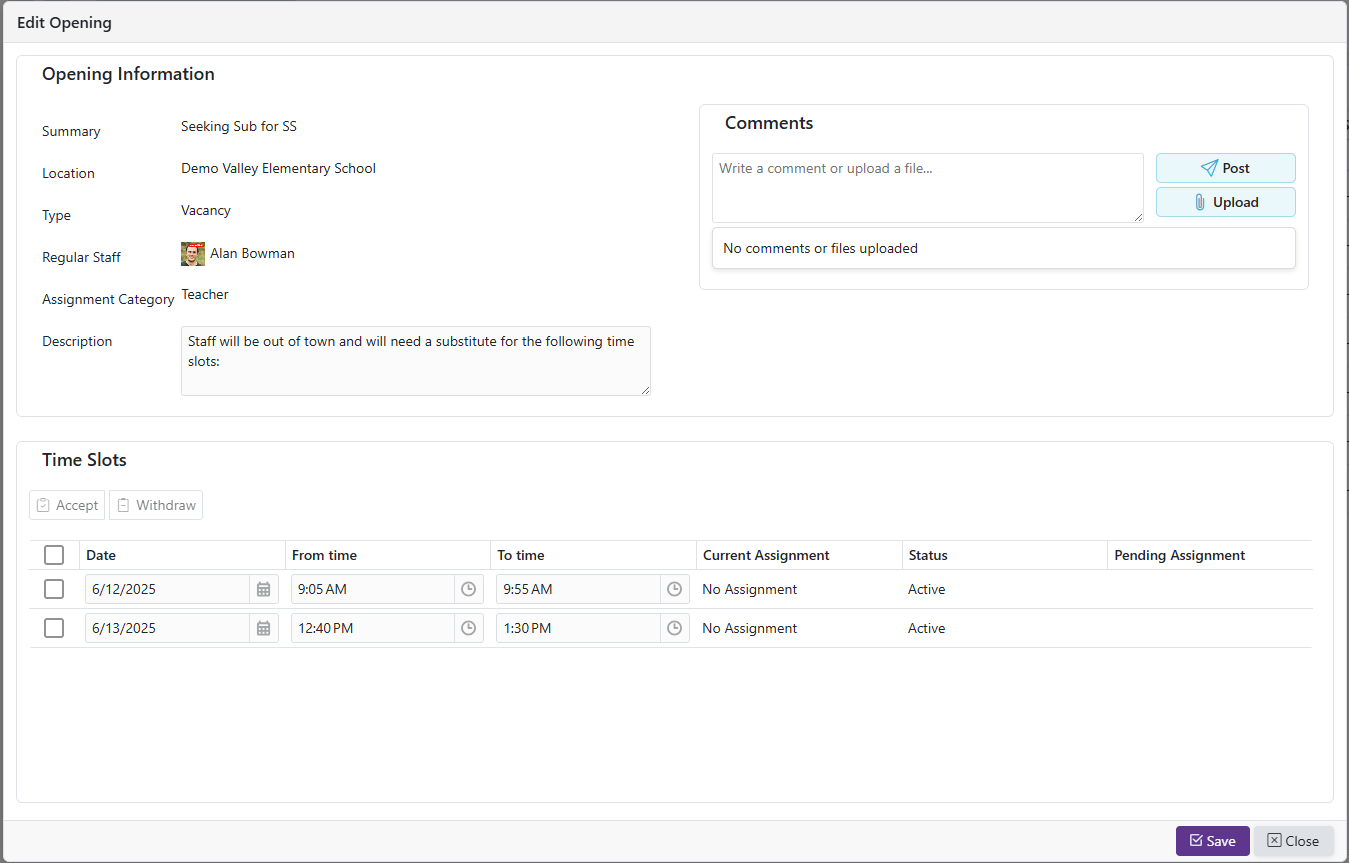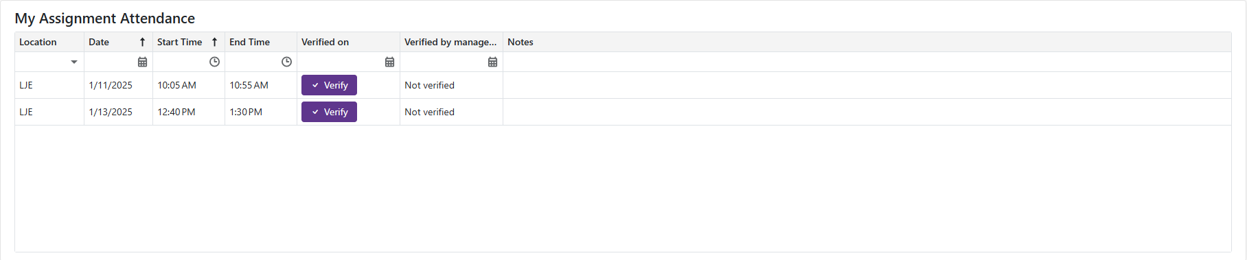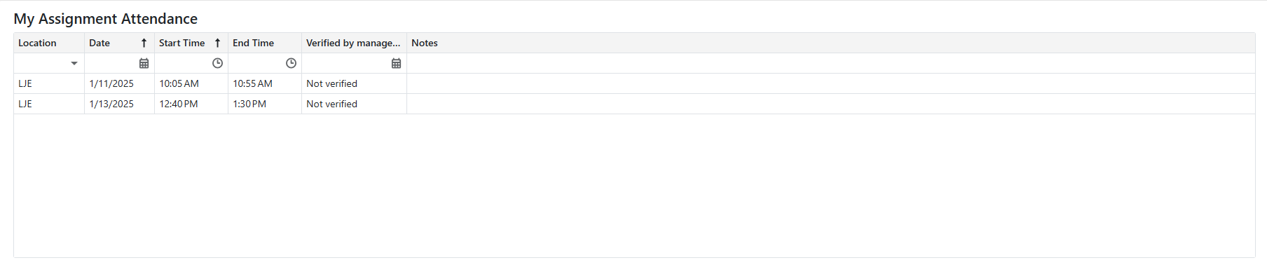 opens the Verify Assignment Attendance form, allowing the substitute to view notes left by the manager, add their own notes, and edit the Actual Time Worked.