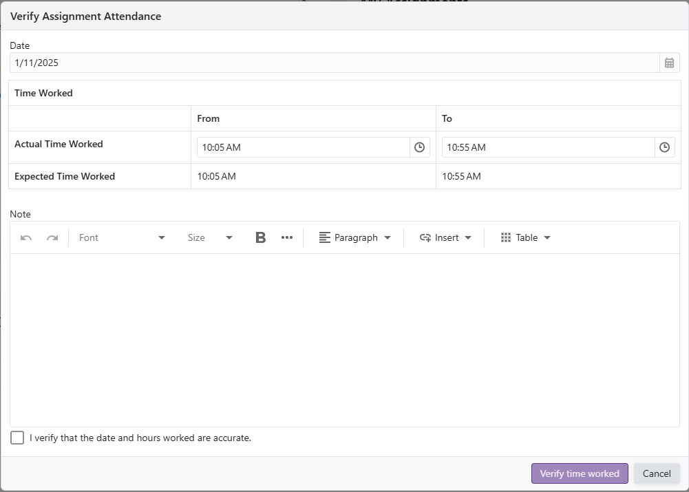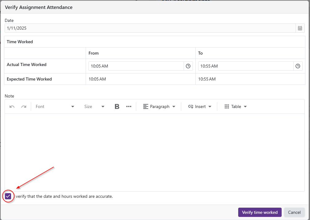 - The 'I verify that the date and hours worked are accurate' checkbox must be checked to make the 'Verify time worked' button available