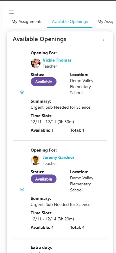 The Available Openings tab displays a list of openings accessible to the user. These are potential openings you can accept as a substitute.