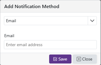 - Clicking Add Plus Icon allows the user to add a Notification method, click 'Save' to add the entered Notification Method