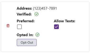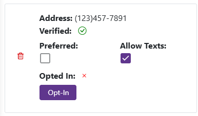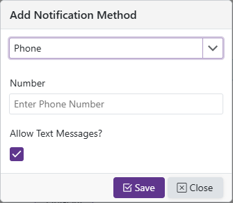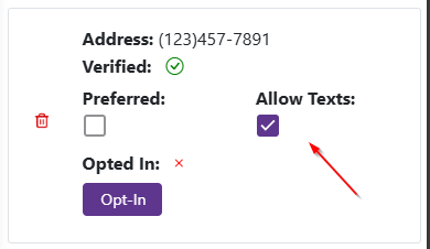 - Clicking the checkbox in the 'Allow Texts' column for a Notification Method enables users to toggle text message permissions. To receive text message notifications, the phone must meet the following criteria: it must be Verified, set as Preferred, have Allow Texts enabled, and be Opted-In.