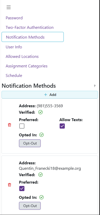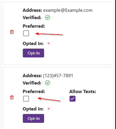 - Clicking the checkbox in the 'Preferred' column for a Notification Method allows users to toggle their preferred notification methods. Notifications will be sent using the selected methods only if they are Verified and Opted-In. For phone notifications, Allow Texts must also be enabled to receive text messages.