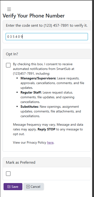 -In the notification methods grid, the user can now Opt-In, select if this method is Preferred, and also choose to allow texts (allow Text is required to receive SMS messages).