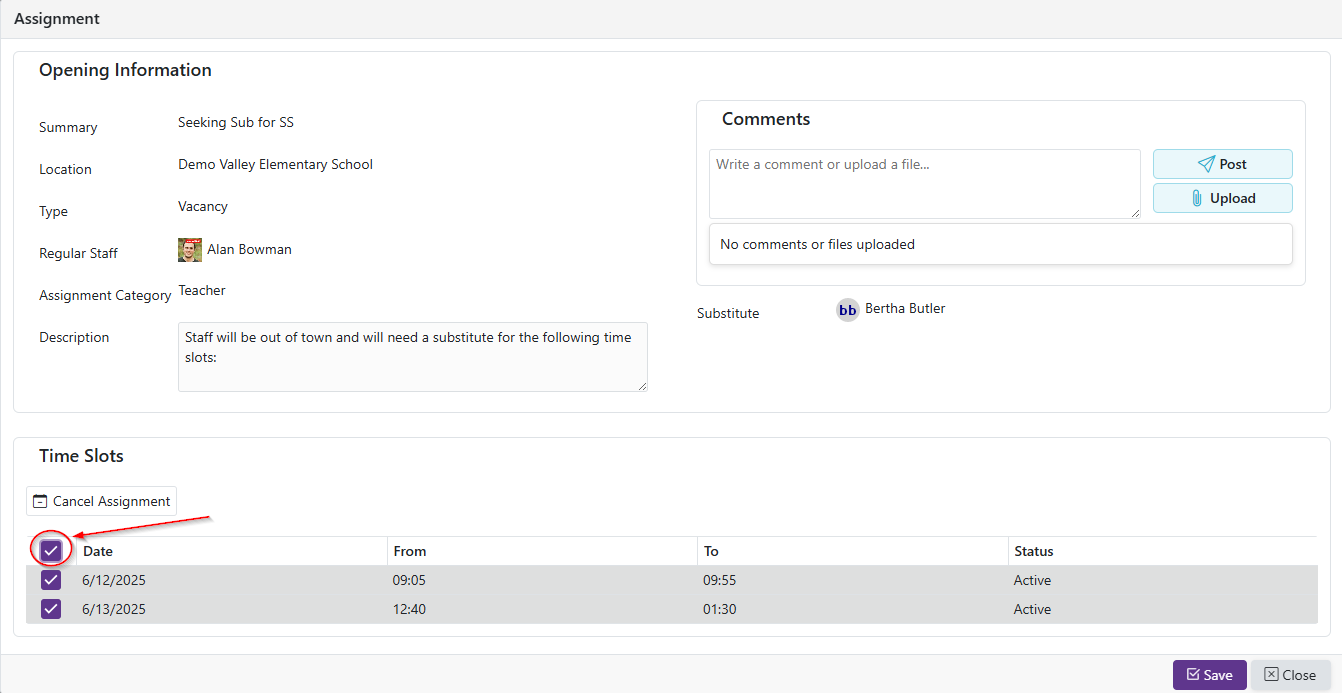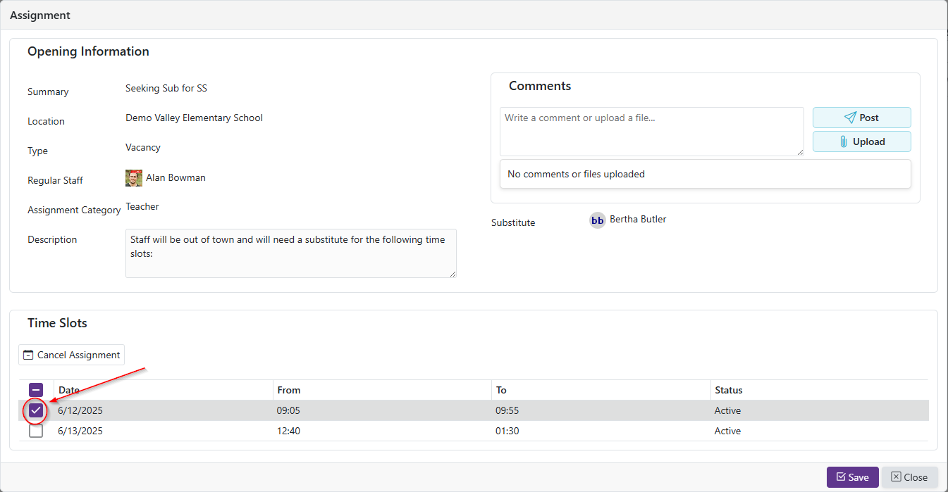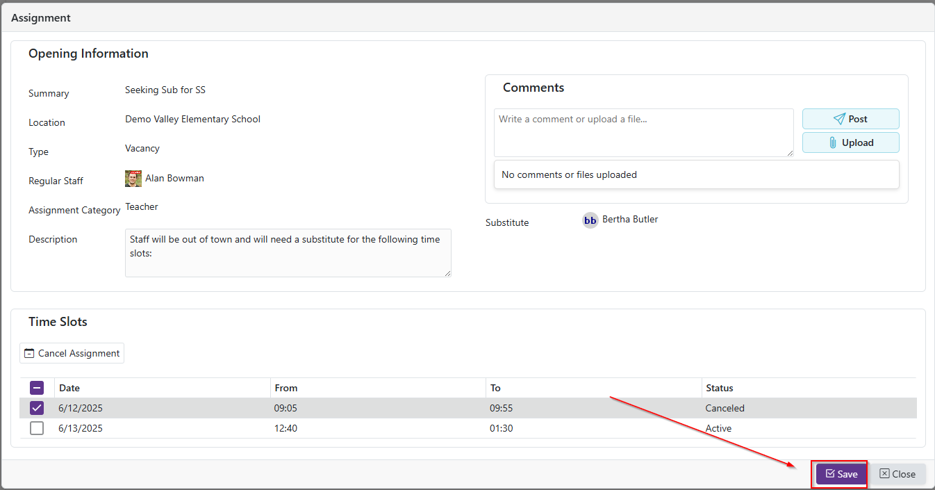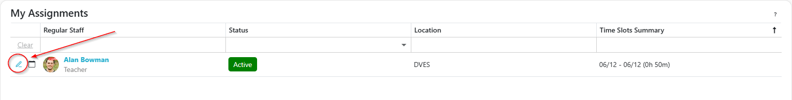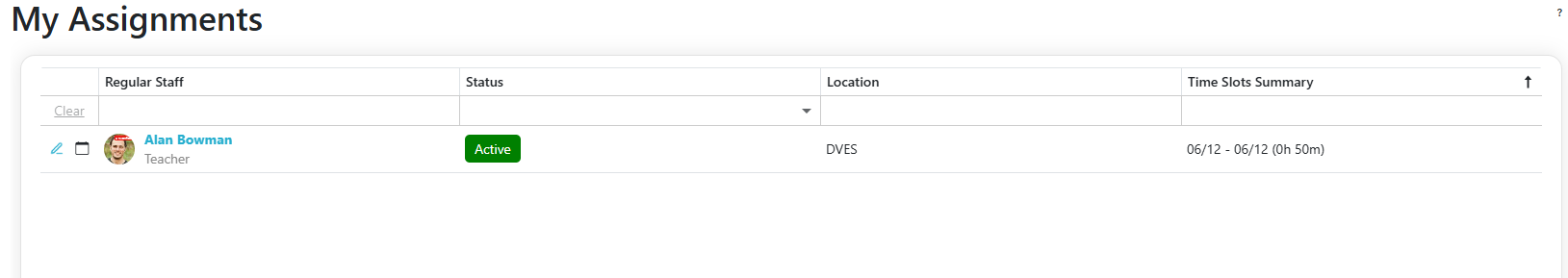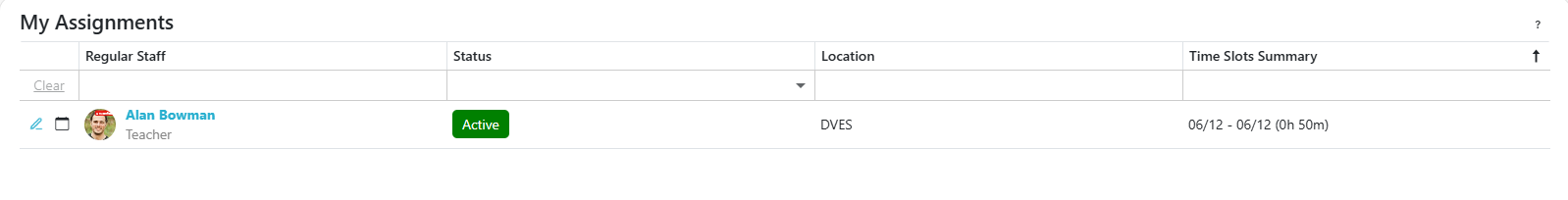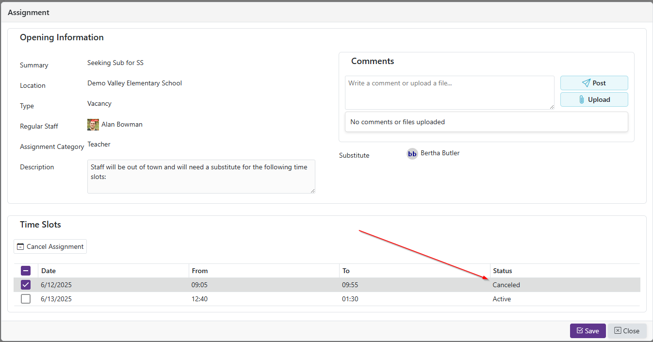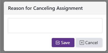 - If all time slots in an assignment have been withdrawn from, the assignment will show the status of Canceled. It will become Active again if a time slot is reaccepted on the available openings grid.